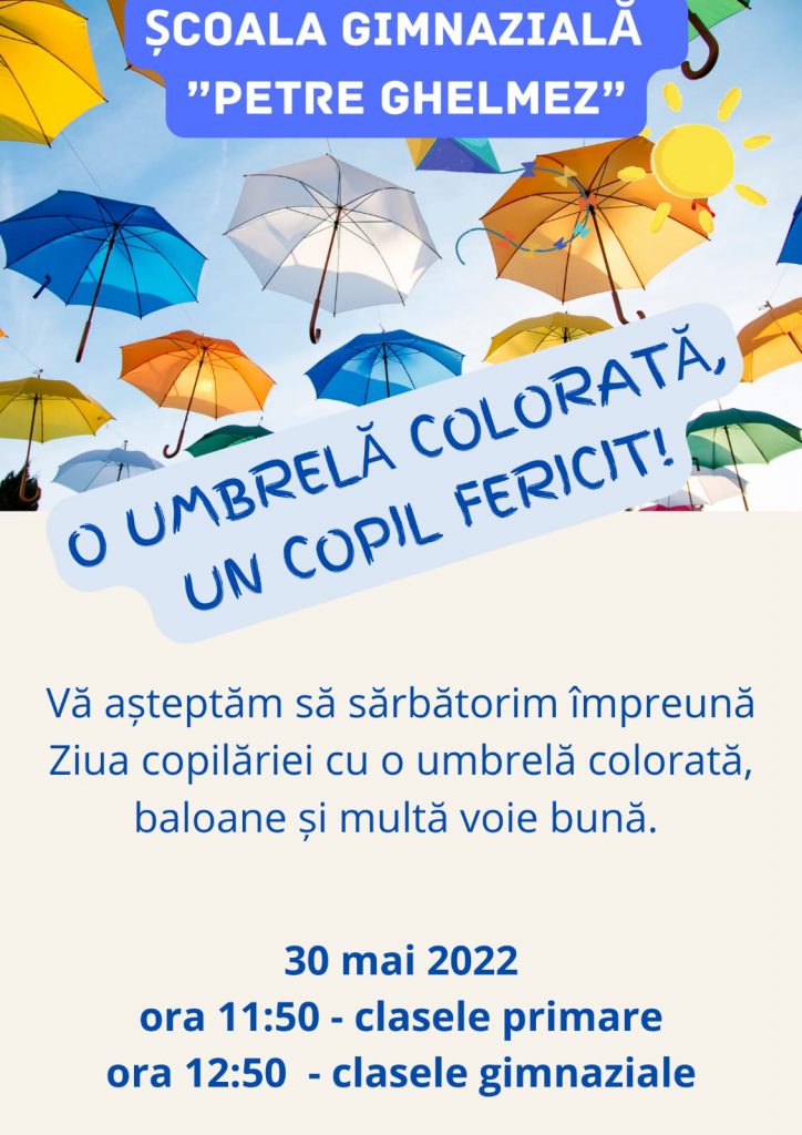 Vă invităm sa petreceţi alaturi de noi, luni, 30 mai 2022, Poveştile Copilăriei, cu o umbrelă colorată si baloane multicolore!